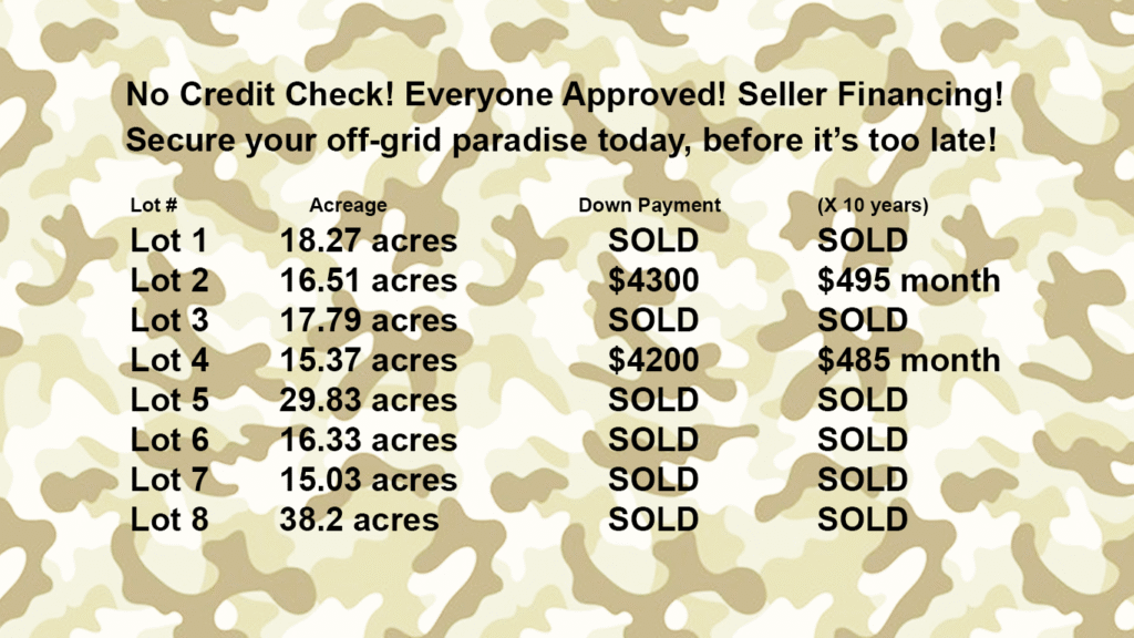 You can use the land while you're paying for it, and there is no obligation to build within a specific timeframe. You’ll have your own private campground and private mountain forest to explore while building your home!
